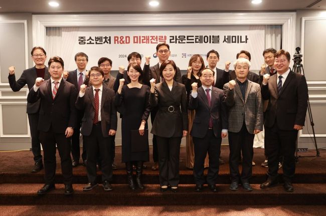 오영주 중소벤처기업부 장관(첫 번째 줄 가운데)이 29일 서울 영등포구 켄싱턴호텔에서 열린 `중소벤처 R&D 미래전략 라운드테이블 세미나`에서 참석자들과 기념 촬영을 하고 있다.