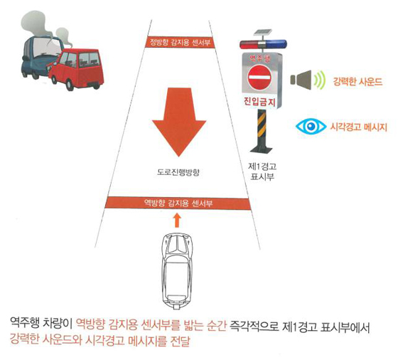 특히 자동감지·경보장치는 바닥에 설치된 센서를 통해 역주행 차량을 자동 감지해 경고음, LED형 진입금지 표지판 점등으로 차량 우회를 유도하는 장치로서 역주행 예방효과가 탁월하다.