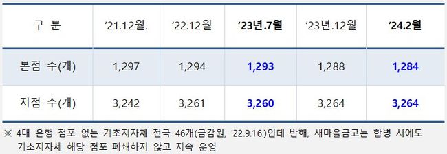 이번 합병을 통해 금고 수는 총 9개 감소했음에도(’23.7월1,293개→’24.2월1,284개) 불구하고, 전국 새마을금고 전체 점포 수(’23.7월3,260개→ ’24.2월3,264개)가 감소하지는 않았다.