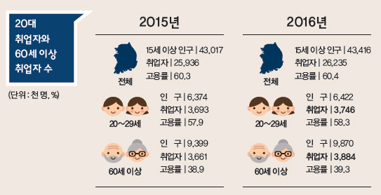 이 중 60세 이상 취업자는 388만 4000명으로 집계됐다. 이는 전년(2015년)보다 22만 3000명 증가한 수치. 반면 20대 취업자는 5만 3000명이 늘어난 374만 6000명에 그쳤다. 60세 이상 취업자가 20대 취업자보다 13만 8000명 많다.