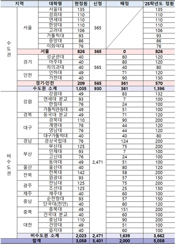 다만, 교육부는 의료 여건이 충분한 서울 지역은 신규로 정원을 배정하지 않았다.