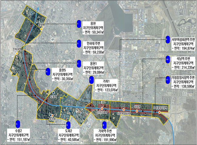 지난 2020년 12월 고시된 11개 지구단위계획은 미추홀구 용현동에서 서구 가정동까지 인천대로 주변 직접 영향권(50m) 이내의 122만㎡로, 축구장(7,140㎡) 170여 개에 달하는 규모다.