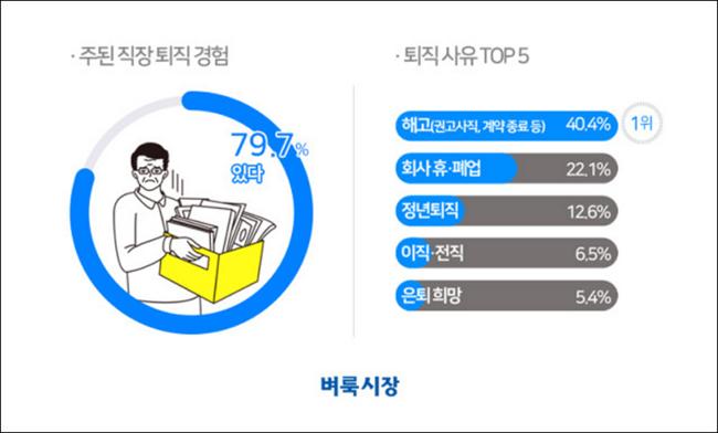 퇴직 사유로는 정년퇴직이 12.6%에 그친 반면 해고, 회사 휴·폐업 등 비자발적 퇴직 비중은 62.5%에 달했다. 자세히 살펴보면 권고사직·정리해고·계약종료 등 해고로 인한 퇴직이 40.4%로 가장 많았으며, △경영악화로 인한 회사 휴·폐업(22.1%) △정년퇴직(12.6%) △이직·전직(6.5%) △은퇴 희망(5.4%) 순으로 이어졌다.