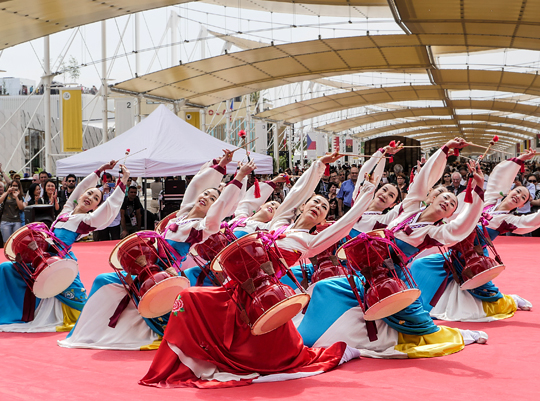 | 23일 오전(현지시간) 이탈리아 밀라노 엑스포장 내 엑스포센터에서 밀라노 엑스포 조직위원회 주관으로 열린 ‘한국의 날’ 공식 기념식에서 국립국악원 길놀이 공연을 따라 관람객들이 한국관으로 이동하고 있다. |