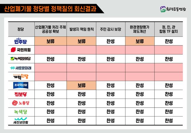 산업폐기물 처리정책에 관한 각 정당들의 입장(환경운동연합 제공)