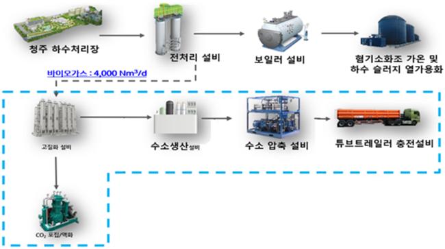 바이오가스 기반 수소 생산‧활용 공정 (예시: 청주 하수처리장 바이오가스 기반 수소 생산‧활용 공정)