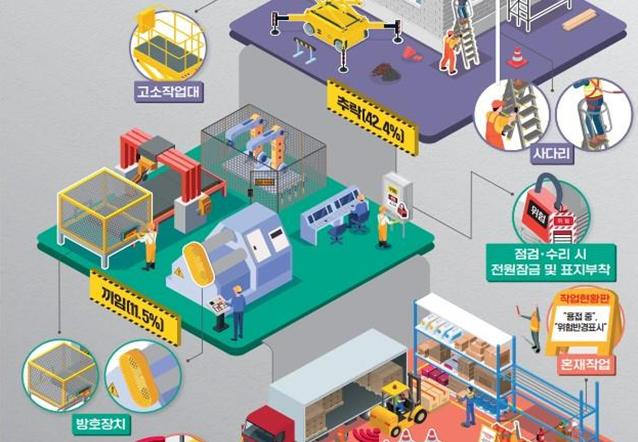 고용노동부와 안전보건공단은 11일, 2024년 제7차 현장점검의 날에 ``떨어짐 · 끼임 · 부딪힘 3대 사고유형 예방`을 주제로 전국의 제조 및 건설 업종 등의 고위험사업장을 방문해 위험성평가를 통한 3대 사고유형 8대 위험요인 관리를 집중 점검한다.