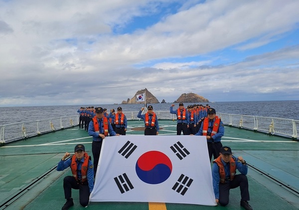▲ 동해해양경찰서 3007함 경찰관들이 설 명절을 앞둔 8일 독도를 앞에 두고 해양 주권 수호를 다짐하고 있다.(동해해경 제공) 2024.2.8. 외교부는 이날 대변인 명의 논평을 통해 “일본 정부가 외교청서를 통해 역사적·지리적·국제법적으로 명백한 우리 고유의 영토인 독도에 대한 부당한 영유권 주장을 되풀이한 데 대해 강력히 항의한다”면서 즉각 철회할 것을 촉구했다.