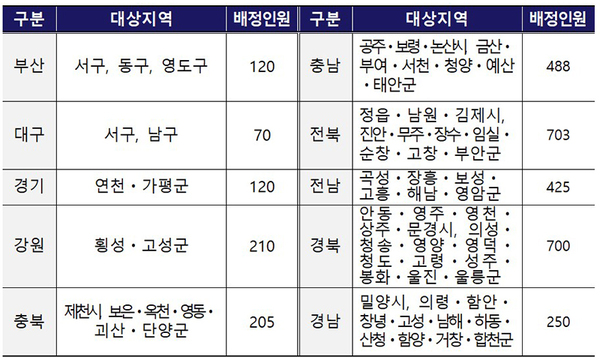 참여지역은 지난해 28개에서 올해 66개 기초지자체로 확대하고, 쿼터는 지난해 1500명에서 올해 3291명으로 2.2배 확대한다.