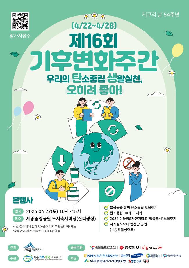 기후변화주간 본행사가 열리는 27일 오전 10시부터는 세종중앙공원 도시축제마당 잔디광장에서 세종기후환경네트워크와 함께하는 ‘북극곰과 함께 탄소중립 보물찾기’, ‘탄소중립 OX 퀴즈대회’ 등이 열린다.