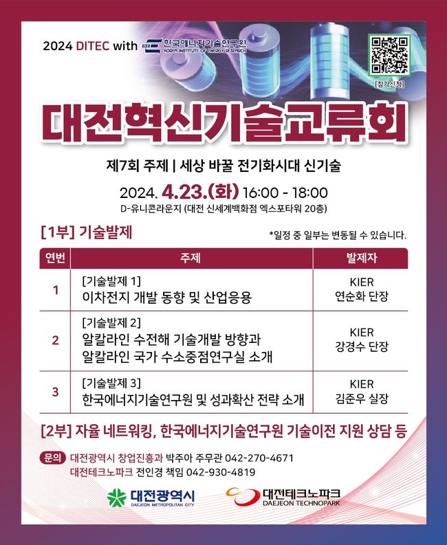 [일간환경연합 김경훈 기자] 대전시는 23일 오후 4시 신세계 엑스포타워 20층 D-유니콘라운지에서 올해 일곱 번째‘대전혁신기술교류회(DITEC)’를 개최하여, 이차전지와 수소 에너지 기술 등 차세대 에너지 혁신기술을 선보인다.