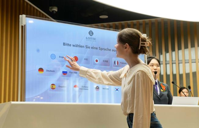 에비뉴엘 잠실점 1층과 롯데월드몰 지하 1층 안내데스크에 설치된 `트랜스 토커`를 외국인 모델이 활용하고 있는 모습.