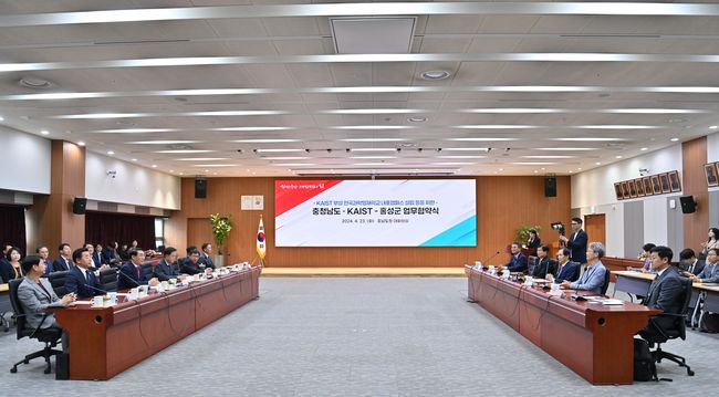 김태흠 지사는 23일 도청 대회의실에서 이광형 KAIST 총장, 이용록 홍성군수와 ‘한국과학영재학교 내포캠퍼스 설립 등을 위한 업무협약’을 체결했다.