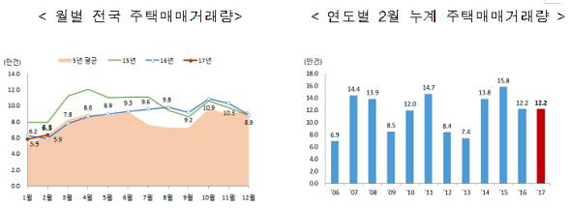 [일간환경연합 장민주 기자]국토교통부는 2월 주택매매거래량이 6만 3484건으로 전년동월 대비 7.1%, 전월 대비 8.4% 증가했으며 5년 평균 2월 거래량보다는 0.7% 감소했다고 14일 밝혔다.