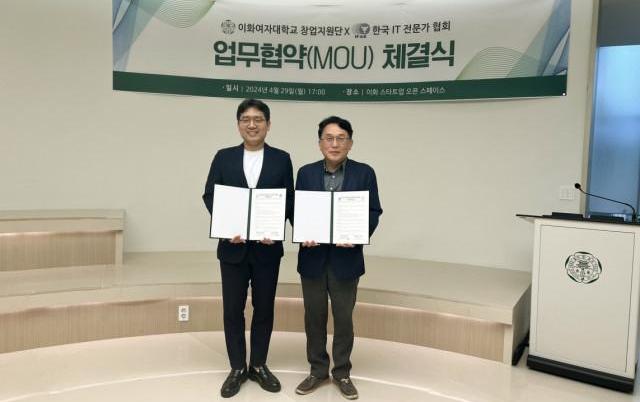 왼쪽부터 이화여자대학교 김상준 창업지원단장과 한국IT전문가협회 배성환 회장이 업무협약 체결 후 기념사진을 촬영하고 있다