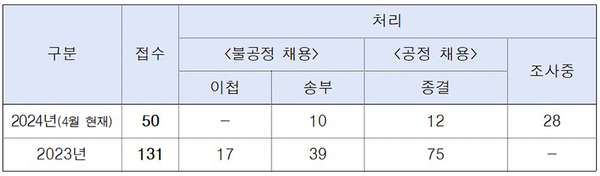 ▲ 국민권익위 채용비리 신고사건 처리현황국민권익위는 공사·공단 등 1400여 개 전체 공직유관단체의 채용과정에서의 공정성을 검증하고 채용비리 발생 여부를 조사하는 공직유관단체 채용실태 전수 조사를 지속 추진하고 있다.