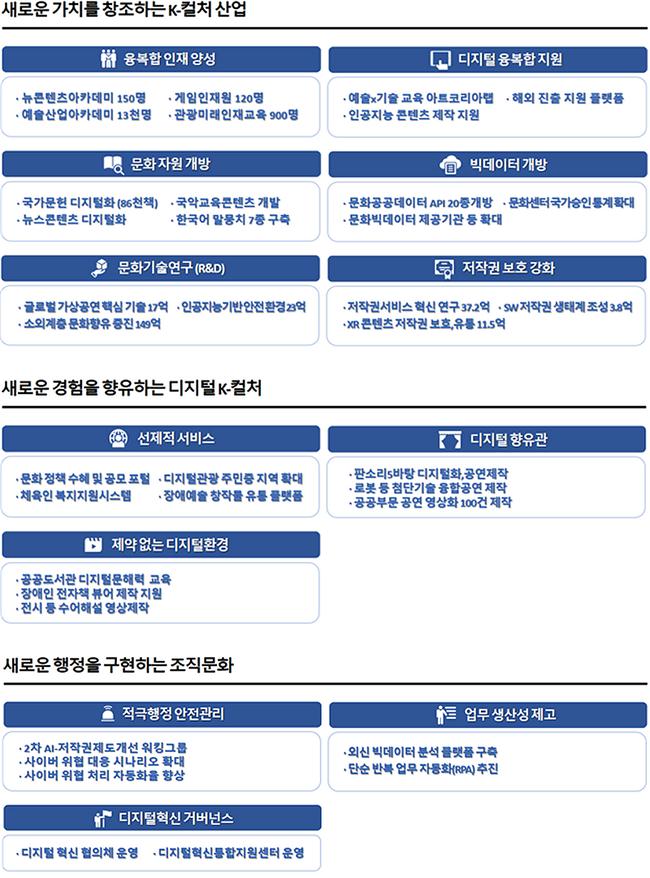 케이(K)-컬처 산업이 디지털과 결합해 새로운 가치를 창조하고, 경쟁력을 확보할 수 있도록 문화와 기술 분야 융·복합 창의인재와 기업을 육성하고, 민간분야 창작 생태계를 지원하기 위한 문화자원의 개방을 확대한다. 초거대 인공지능, 디지털 플랫폼 등 핵심 분야 선도기술 개발도 적극 지원한다.