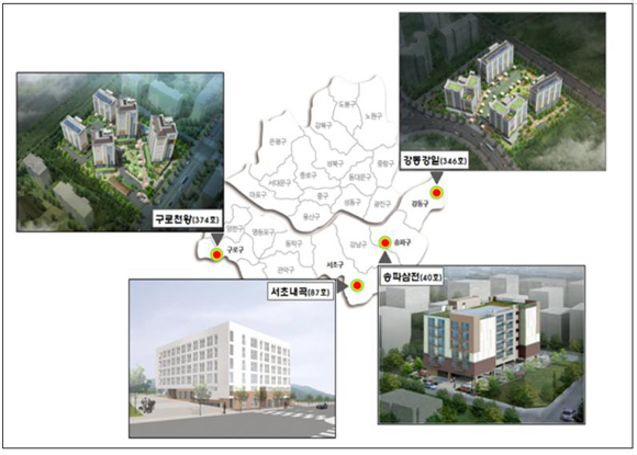 송파삼전지구(40가구)는 8호선 석촌역 인근에 위치하며 청소년문화센터 스터디룸 주민카페 게스트하우스 등이 함께 설치된다.