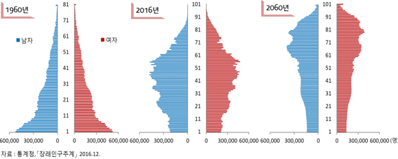 통계청은 “저출산의 영향으로 출생아수는 계속 감소하고 의료기술 발달 등으로 인한 수명 연장으로 65세 이상 인구는 계속 증가해 우리나라 인구의 연령구조는 2016년 현재 30~50대가 가장 넓은 형상에서 2060년에는 점차 윗부분이 넓은 모습으로 전환될 예정”이라고 말했다.