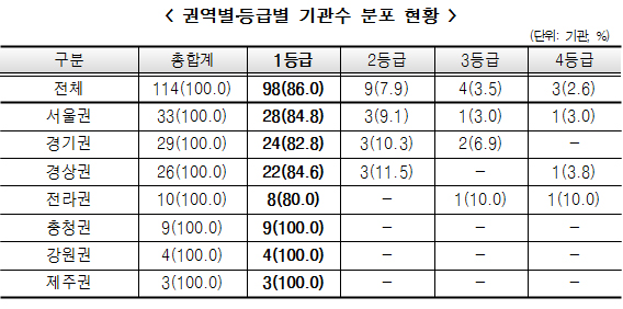 2등급은 9개(7.9%), 3등급은 4개(3.5%), 4등급은 3개(2.6%)였고, 최하등급인 5등급은 없었다.