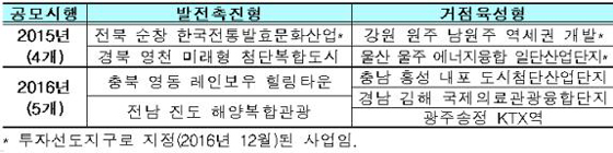 지난 2015년 시작된 투자선도지구 공모는 올해 세 번째로 지난 2년 동안 50여개 이상의 지자체가 참여한 두 번의 공모에서 충북 영동 레인보우 힐링타운, 광주송정 KTX역 등 발전 잠재력이 있고 지역특색을 살린 9개 사업이 선정됐다.