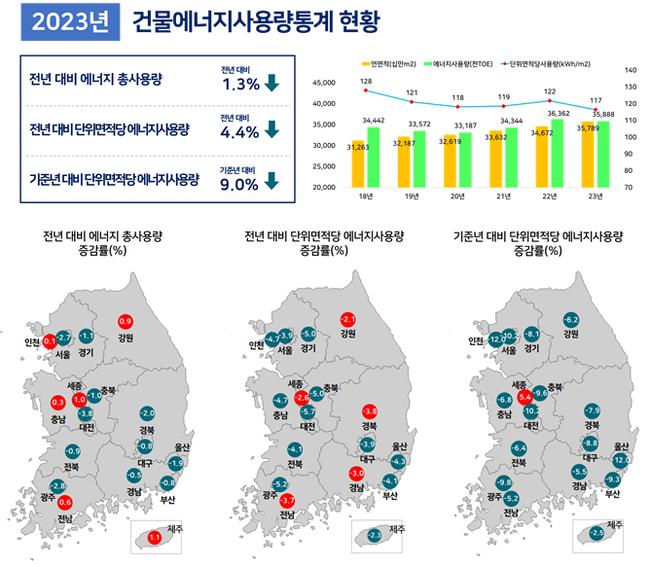 [일간환경연합 한선미 기자] 국토교통부는 지난해 전국 모든 건물의 에너지사용량을 집계한 결과, 에너지 총사용량과 단위면적당 에너지사용량이 전년 대비 각각 1.3%, 4.4% 감소했으며, 기준년(`18년) 대비 단위면적당 사용량은 9.0% 감소했다고 밝혔다.