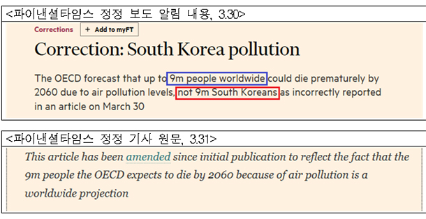 또한 지난 3월 29일 영국 파이낸셜타임즈에서 한국 조기사망자 수를 900만 명으로 보도했다가 31일 900만 명은 전세계 조기사망자 수라고 정정 보도했다 고 설명했다.