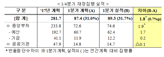 기획재정부는 6일 올해 1분기 계획(31%) 대비 1조 8000억원( 0.7%포인트)을 초과한 89조 3000억원의 재정을 집행했다고 밝혔다.