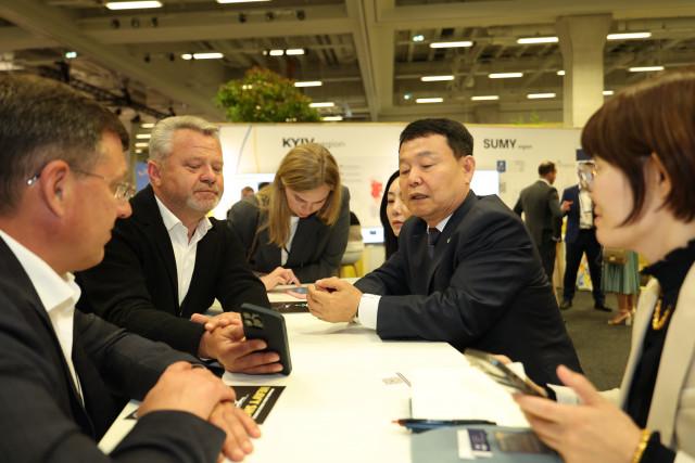 윤석대 한국수자원공사 사장은 6월 11일부터 12일 독일 베를린에서 열린 우크라이나 재건회의 `URC 2024`에서 우크라이나 정부 고위관계자 등과 도시개발 및 물 분야 재건협력 구체화를 위한 밀도 높은 만남을 이어갔다. (사진 오른쪽 두 번째 윤석대 한국수자원공사 사장, 사진 왼쪽 첫 번째부터 이고르 사포즈코 브로바리 시장, 아나톨리 페도룩 부차 시장, 알리나 사라뉴크
