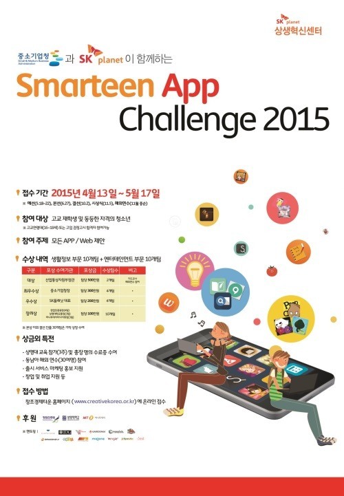 중소기업청은 SK테크엑스와 공동으로 고교생 앱 개발 경진대회인 ‘스마틴 앱 챌린지 2017(Smarteen App+ Challenge 2017)’를 개최하기로 하고, 다음달 14일까지 약 5주 동안 참가자를 모집한다.