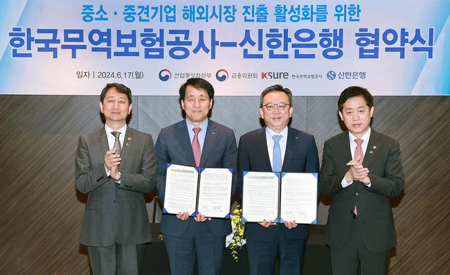 [일간환경연합 장민주 기자] 안덕근 산업통상자원부 장관과 김주현 금융위원장이 참석한 가운데, 신한은행(정상혁 은행장)과 한국무역보험공사(장영진 사장)는 6.17일(월) `중소·중견기업 해외진출 활성화 지원 업무협약`을 체결했다.