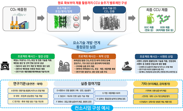 ▲ CCU 전주기 밸류체인 구성(안)이번 CCU 메가 프로젝트는 연구개발 주체(출연연, 대학 등)는 물론 이산화탄소 발생원이 존재하는 수요기업, CCU 제품 활용 기업, 감축량 평가·검증 기관 등이 모두 참여하는 컨소시엄 형태다.