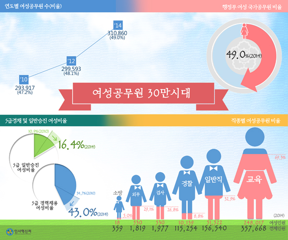 인사혁신처는 2014년 말 현재 행정부 국가 공무원 가운데 여성 공무원 숫자가 31만 860명을 기록했다고 1일 밝혔다. 이는 전체의 49.0%에 해당하는 수치다.