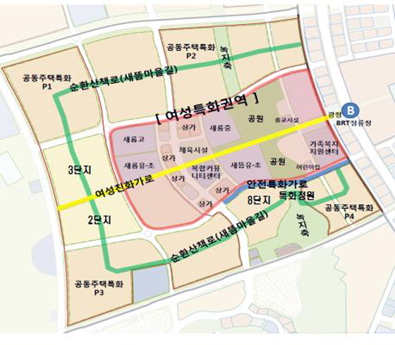 또한 여성특화권역 내 학교(유·초·중·고, 6곳)와 공공시설(복합커뮤니티센터), 광역복지지원센터, 공원·체육시설·상가 등을 집약 배치해 여성들의 주요 이용 시설에 대한 보행동선이 효율적이고 편리하도록 계획했다.