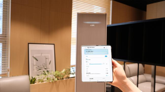 삼성전자 통합 연결 플랫폼 스마트싱스로 에어컨의 상태를 확인하는 모습