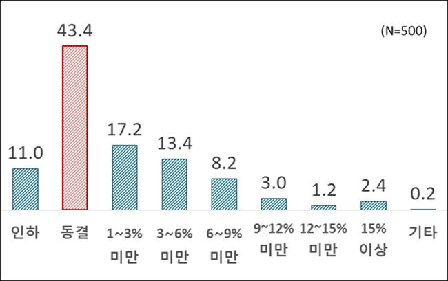 적정 최저임금 인상 수준에 대한 의견을 구체적으로 살펴보면, ‣동결(43.4%), ‣1% 이상 3% 미만 (17.2%), ‣3% 이상 6% 미만(13.4%), ‣인하(11.0%), ‣6% 이상 9% 미만(8.2%) 순으로 나타났다.