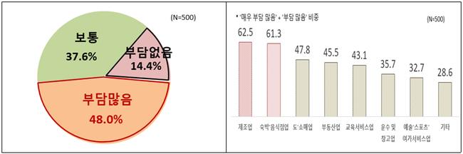 부담이 없다고 응답한 비중은 14.4%에 불과했다. 현재의 최저임금 수준이 경영에 부담된다고 응답한 비중을 업종별로 살펴보면, ‣제조업 62.5%, ‣숙박·음식점업 61.3%, ‣도‧소매업 47.8%, ‣부동산업 45.5% 등의 순으로 나타났다.