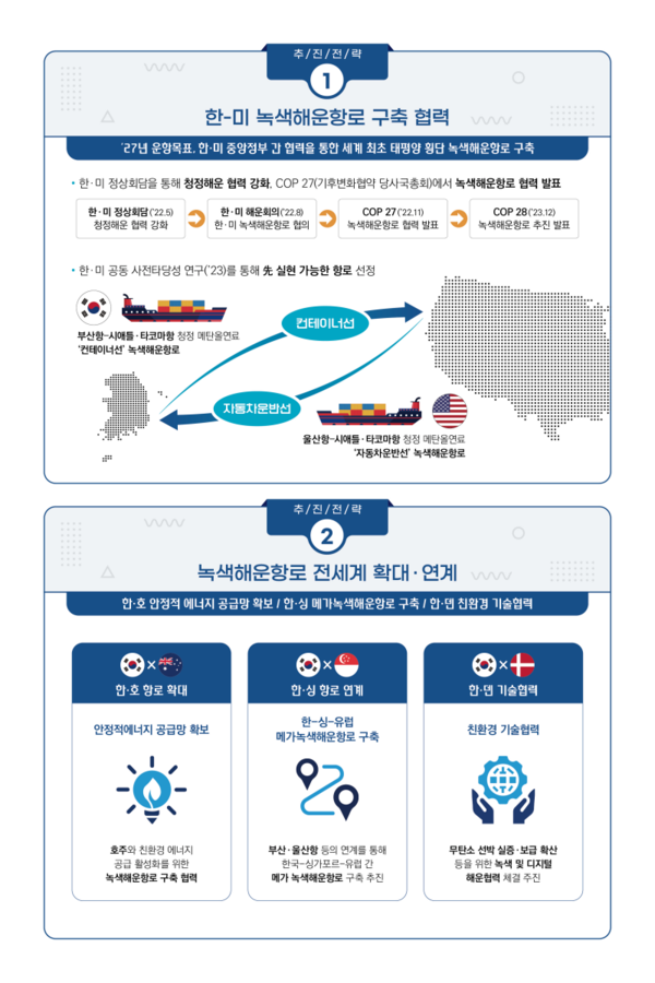 우리나라는 지난 2022년 제27차 유엔기후변화협약 당사국 총회에서 한-미 녹색해운항로 구축 협력을 발표한 이후 사전 타당성 조사를 통해 부산·울산항과 미국 시애틀·타코마 항 간 컨테이너선 항로와 자동차운반선 항로를 예비 녹색해운항로로 선정했다.