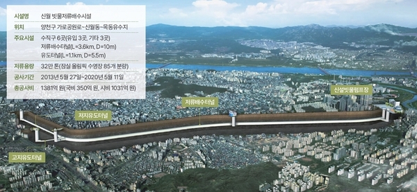 ▲ 서울 양천구 신월동 일대 상습 침수피해를 해결하기 위해 2020년 준공된 신월 빗물저류배수시설 모식도. 국내 최초의 대심도 터널형 지하 저류시설이다. 사진 양천구청 서울 양천구 신월 빗물저류배수시설 장마 대응 체계 가동