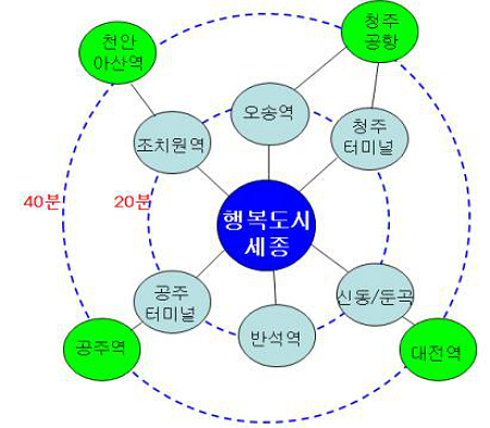 또 40km 반경 내외에 위치한 청주국제공항, KTX대전역, KTX공주역, KTX천안아산역을 4대 광역교통 거점으로 해 광역BRT로 40분대에 연결시킨다.