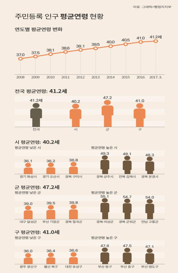 주민등록 인구통계 시스템으로 처음 집계가 이뤄진 2008년 평균연령은 37.0세였으나 2014년 처음 40대에 진입했고 3년 사이에 1.2세 더 늘어났다.