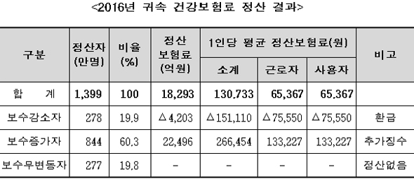 • 2016년 보수변동 따른 정산 실시…278만명은 보험료 환급받아