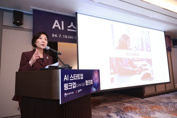 ▲ 오영주 중소벤처기업부 장관이 10일 서울 강남구 조선팰리스에서 열린 ‘AI 스타트업 링크업(Linkup) 협의회’에서 초격차 AI 스타트업 레벨업(LevelUp) 전략을 발표하고 있다.(제공=중소벤처기업부) 이번 협의회는 지난 3월 온디바이스(On-Device) AI 챌린지 출범식에서 AI 스타트업이 대기업과 협업을 통해 함께 성장하고, 글로벌 진출을 가속화할 수 있는 소통채널을 만들자는 오영주 중기부 장관의 약속을 이행하기 위해 마련했다.