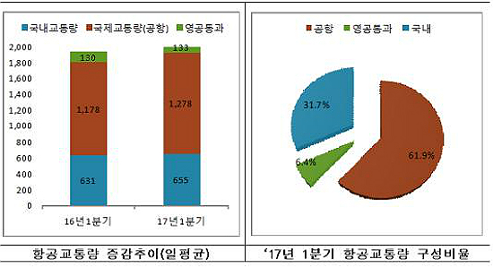 공항별 교통량을 살펴보면 인천공항은 동계 성수기, 봄방학 시즌 및 원화강세로 인한 해외여행수요 증가 등으로 지난해 동기 대비약 7.3% 증가했다. 김해공항은 일본과 동남아 노선, 휴양지인 괌 사이판 등 대양주 노선의 운항증대에 힘입어 전년 같은 기간 대비 12.6% 증가했다.