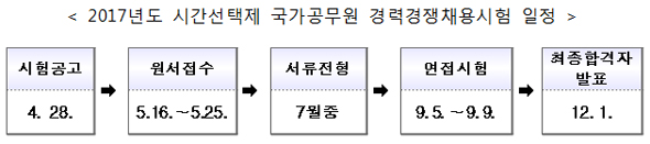 2017년도 시간선택제 경력경쟁채용시험은 다음달 16~25일 원서접수를 시작으로 7월 서류전형, 9월 5∼9일 면접시험을 거쳐 12월 1일 최종합격자를 발표한다.
