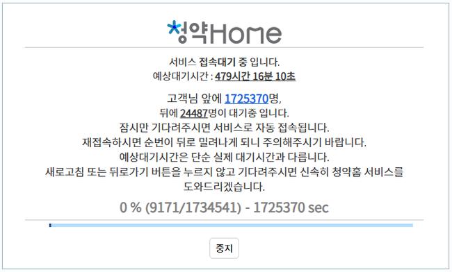 이날 오전 9시부터 청약홈에 접속자가 몰리면서 대기 인원이 최대 200만명, 접속 대기 시간이 길게는 600시간까지 안내되고 있다.