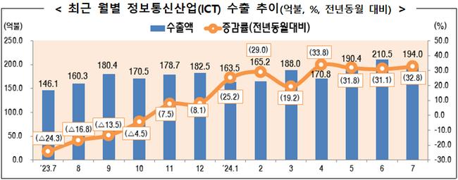 [일간환경연합 장민주 기자]2024년 7월 정보통신산업(ICT) 수출이 194억 달러(약 26.4조 원)를 기록하며 4개월 연속 30% 이상의 증가율을 달성했다.