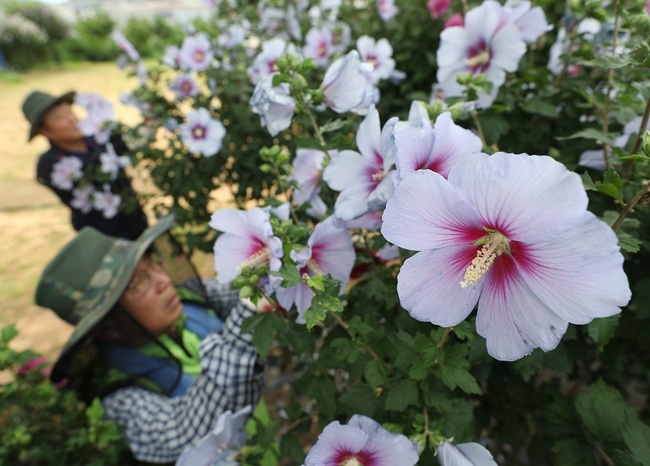 ▲ 제헌절을 이틀 앞둔 15일 오전 경기 수원시 권선구 수원무궁화원에서 관계자들이 무궁화를 돌보고 있다. 2024.7.15(ⓒ뉴스1.) 공모대상은 각 지방자치단체와 기관에서 조성한 무궁화동산, 가로수길 등이며 오는 28일까지 산림청에 공문으로 신청서를 접수하면 된다.