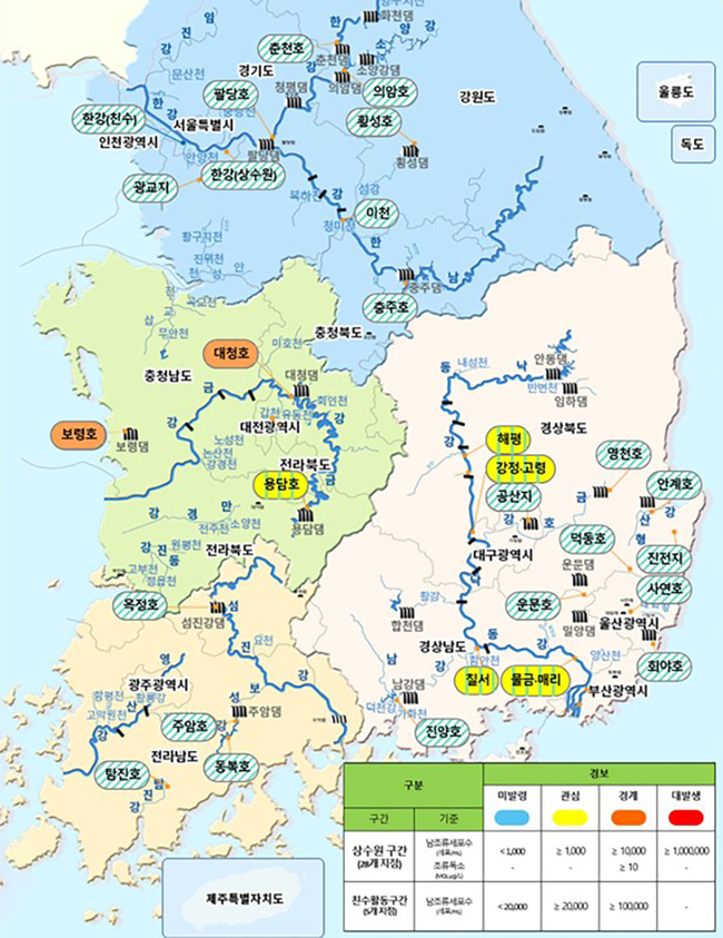 아울러 낙동강 해평, 강정고령, 칠서, 물금매리, 금강 용담호 지점에는 ‘관심’ 단계가 발령되었지만 먹는물 안전에는 모두 이상이 없다고 밝혔다.