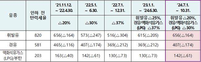 [일간환경연합 신상미 기자]정부는 ’24.8.31. 종료 예정인 유류세 한시적 인하(현행 휘발유 △20%, 경유․ 액화석유가스(LPG)부탄 △30%) 조치를 ’24.10.31.까지 2개월 추가 연장할 계획이다.